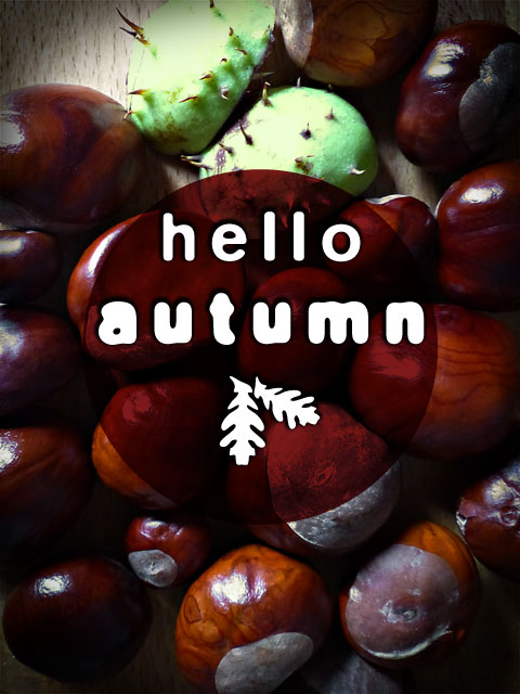 Bonjour l'automne est une illustration avec le texte en anglais «Hello autumn» écrit sur des marrons qui sont tombés de l'arbre fin septembre. Un pictogramme avec 2 feuilles de chêne tombant accompagne cette image et représente la chute des feuilles caduques.